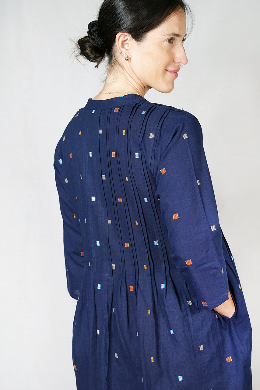 This dress has a fresh, cool design. It is woven from 100% cotton in midnight blue with small square motifs in orange, taupe and pale blue; this dress has wide pin tucking details on the front and back of the bodice that softly gather the skirt. The dress is v-necked with a mandarin collar and has three quarter length sleeves, pockets and is mid-calf in length. Available in sizes XS to XL. M is equal to size 12 in Australia.