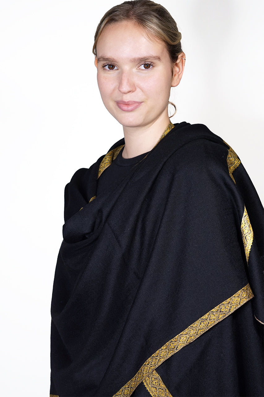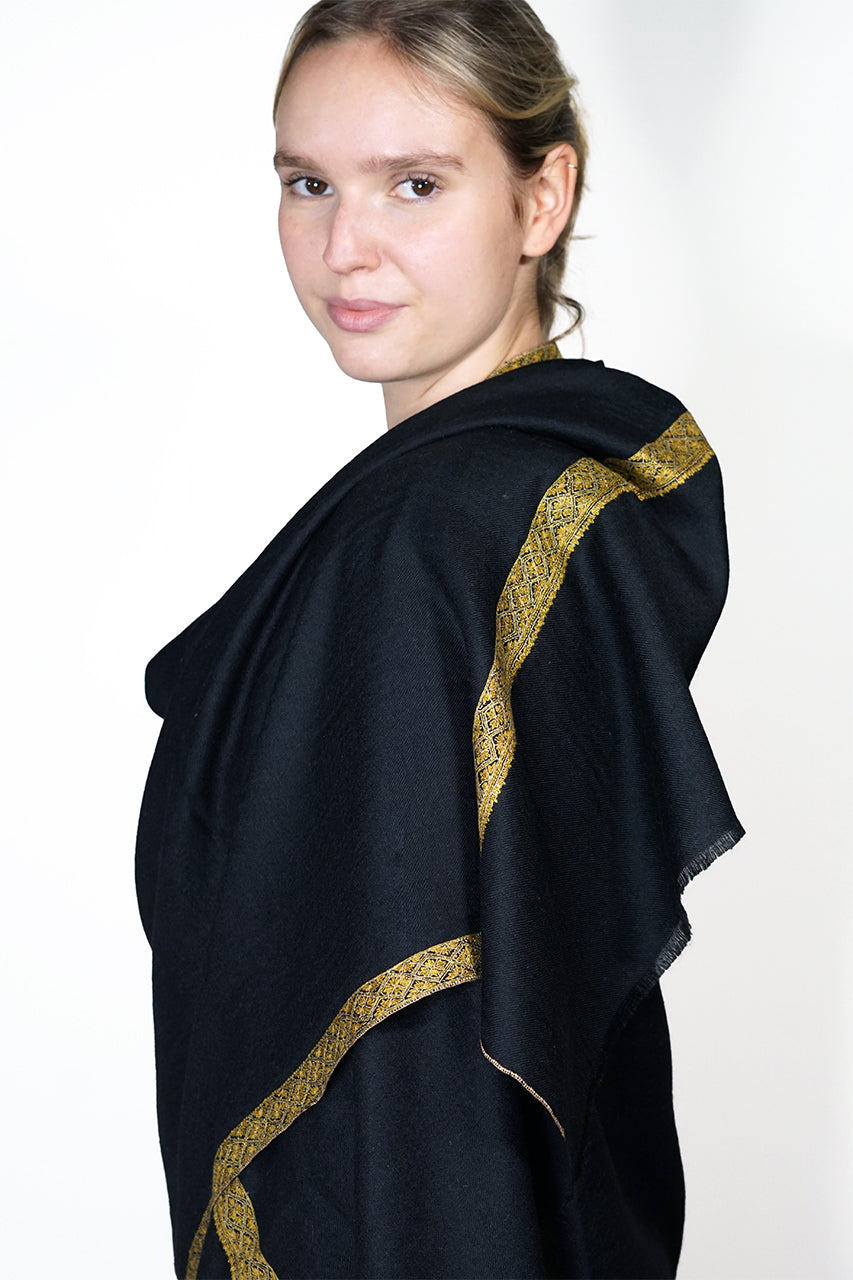 This hand woven pashmina shawl is black in colour with thin sozni embroidered bands in contrasting gold on each end and along the sides. It is known as a hashidar scarf because of the thin embroidered bands. This elegant scarf is of the finest quality and is 70x200cm in size. Handcrafted by an artisan community in Kashmir, India.