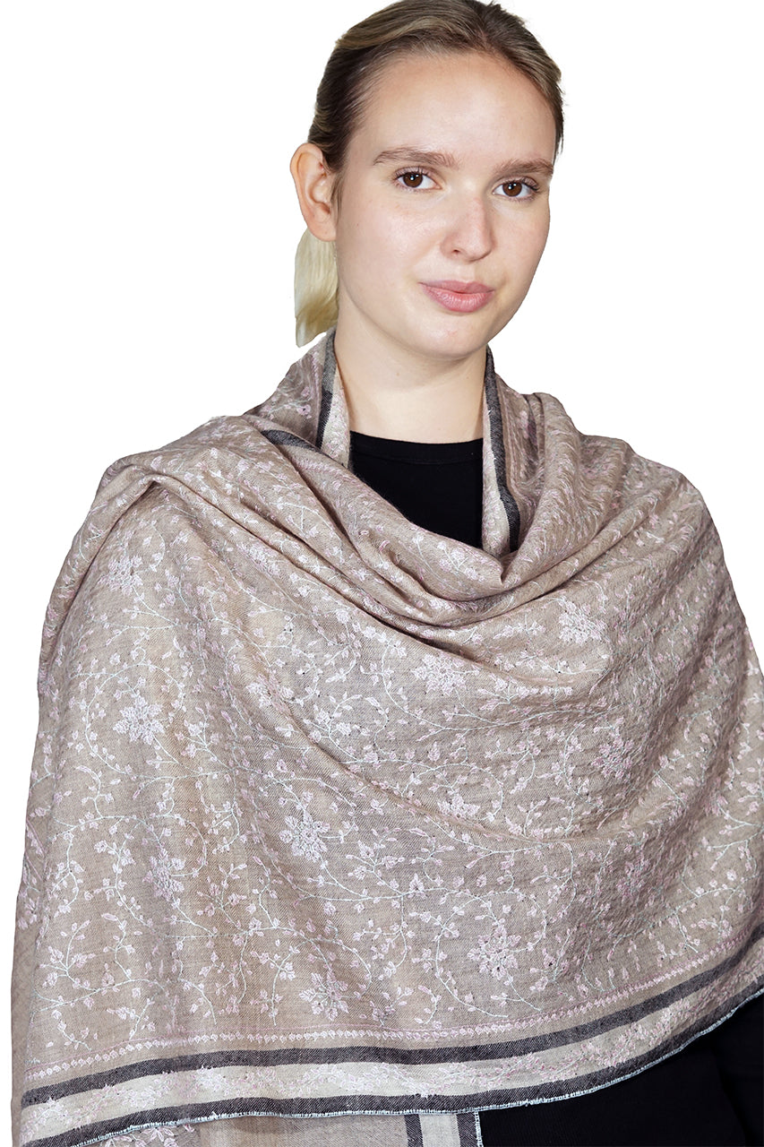 This pashmina scarf is hand woven from undyed natural cashmere or pashmina with contrasting dark stripes along the edge. This scarf has an all over delicate floral design of sozni embroidery in pink and white. All over embroidery design is known as jali. This pretty scarf is of the finest quality and is 70x200cm in size. Handcrafted by an artisan community in Kashmir, India.