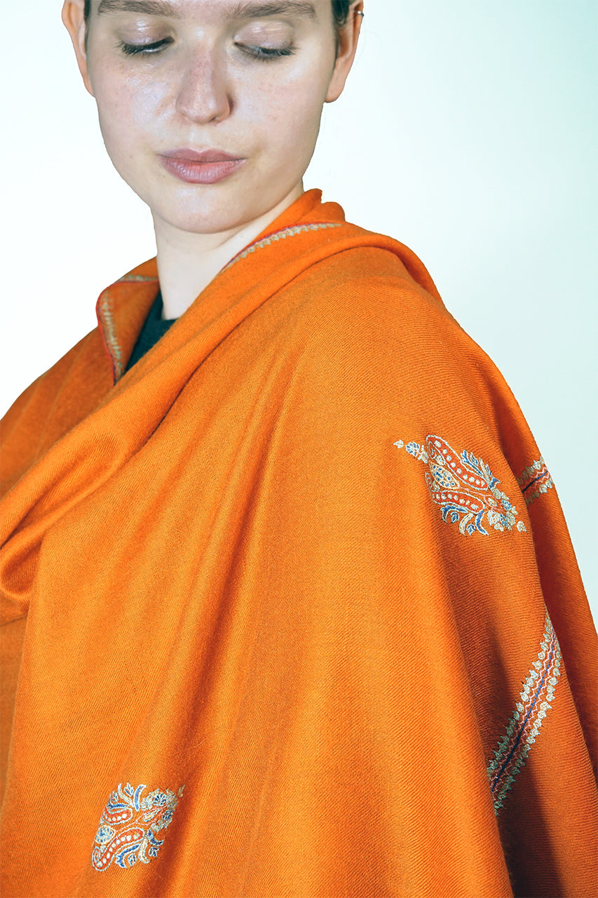 This scarf is crafted from orange hand woven pashmina or cashmere. The sozni embroidered motifs in pale blue, blue and white in a filigree pattern are scattered over the scarf and there is also a fine embroidered border design. This vibrant scarf is 70x200cm in size and referred to as butidar which describes the large scattered motifs. Handcrafted by an artisan community in Kashmir, India.