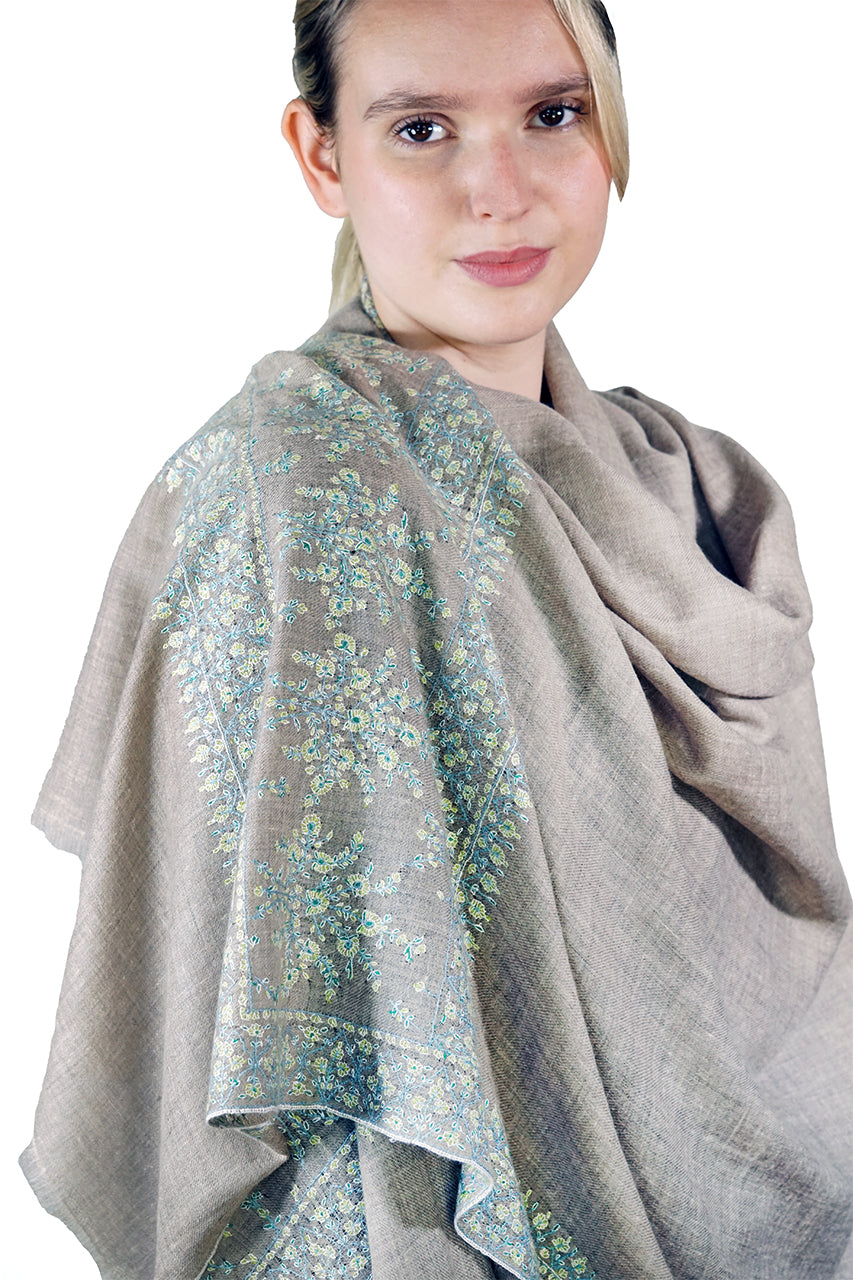 This hand woven pashmina shawl is of undyed natural cashmere with an exquisite sozni embroidered wide floral border design in pale blues and greens. This unique shawl is of the finest quality and is 100x200cm in size. Handcrafted by an artisan community in Kashmir, India.
