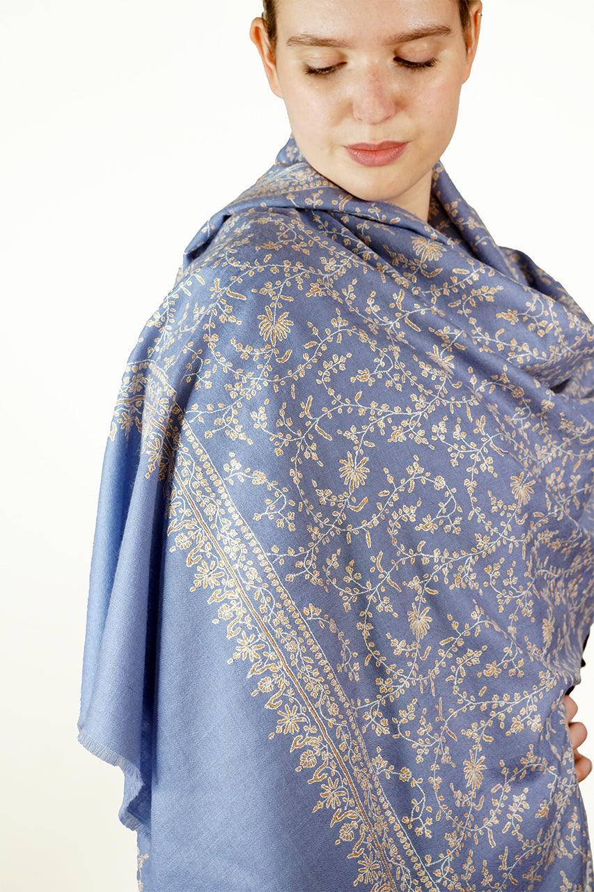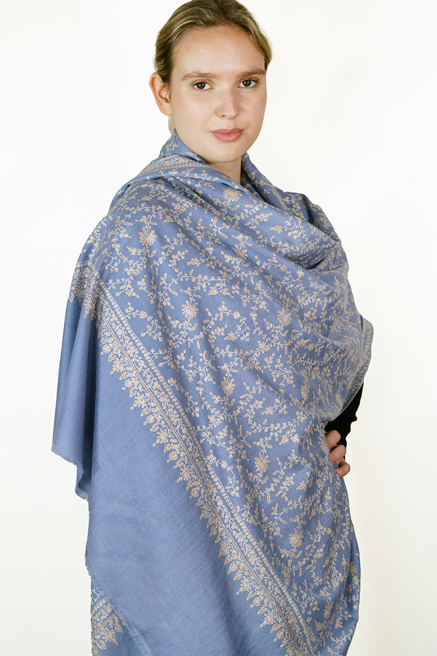 This hand woven pashmina shawl is a pretty blue coloured cashmere with an all over floral design of sozni embroidery in pale pink and white. This unique shawl is of the finest quality and is 100x200cm in size. Handcrafted by an artisan community in Kashmir, India.