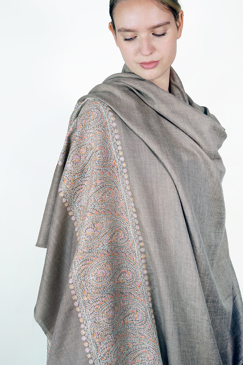 This hand woven pashmina shawl is of undyed natural cashmere, dark oatmeal in colour with an exquisite sozni embroidered wide border design of large paisley motifs in oranges and cream. This unique shawl is of the finest quality and is 100x200cm in size. Handcrafted by an artisan community in Kashmir, India.