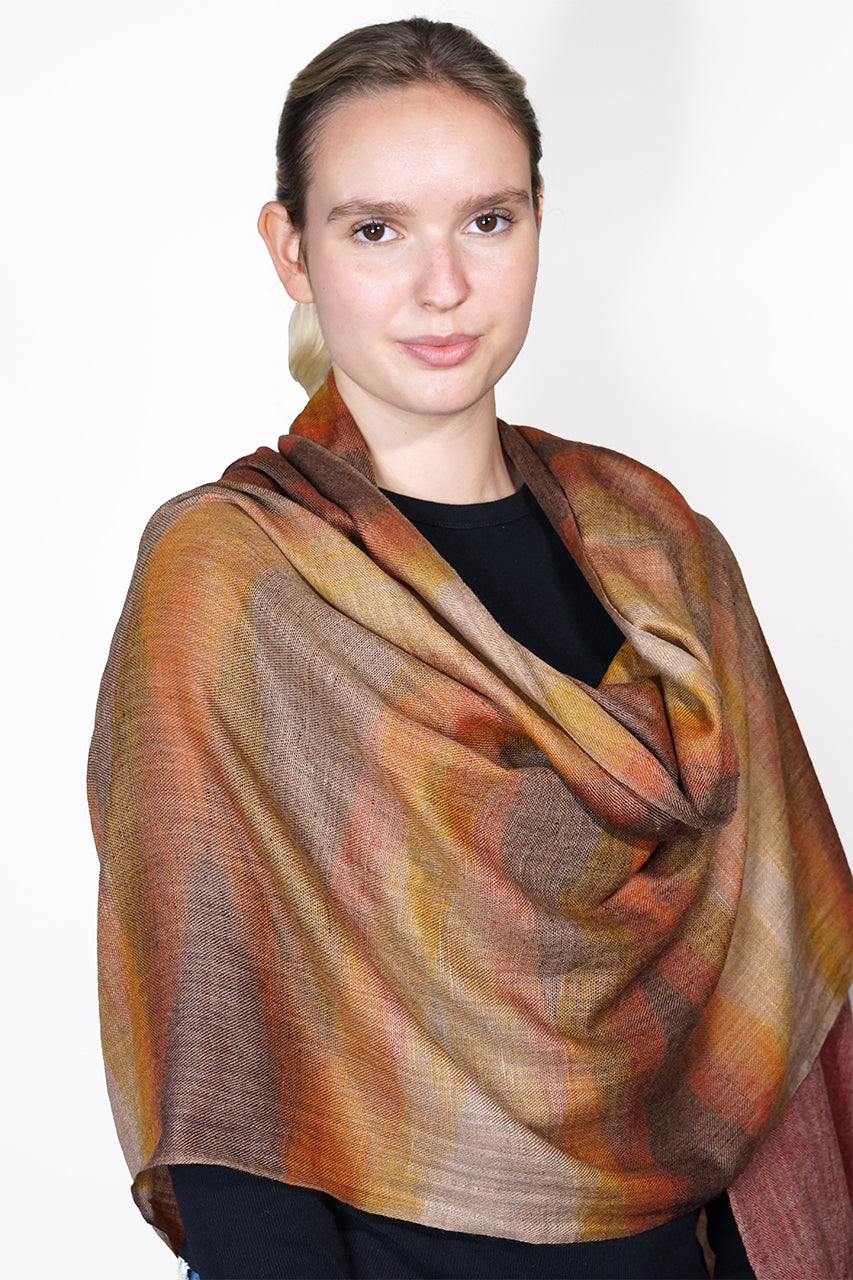 Everyone needs a cashmere scarf. Our hand woven scarves are 70x200cm. Light but warm, these cashmere scarves are perfect for travel and stylish for all occasions. This beautiful scarf is an ikat weave in earthy tones of burnt orange, ochre, brown and natural. Handcrafted by artisans from the Kashmir shawl community.