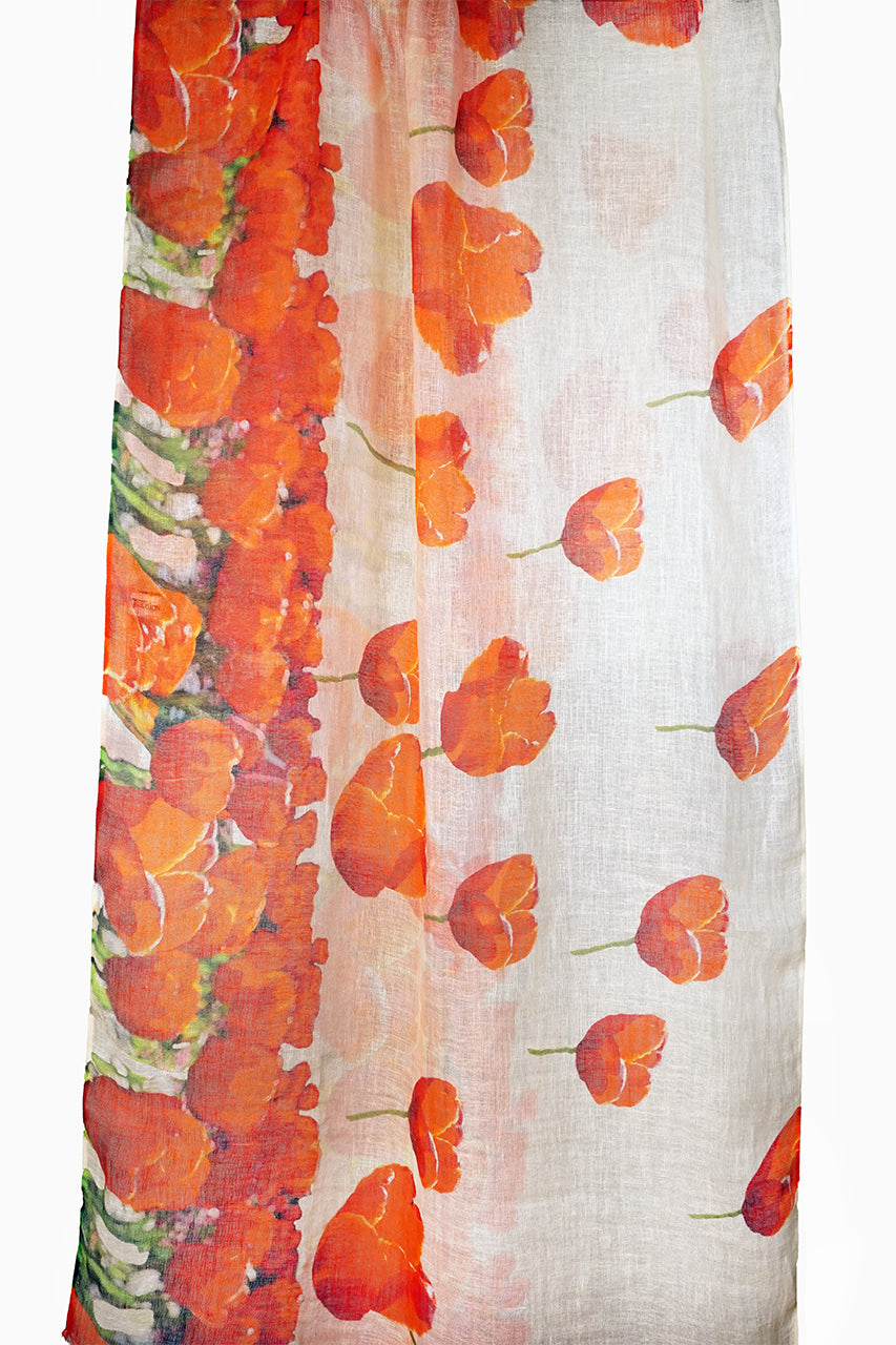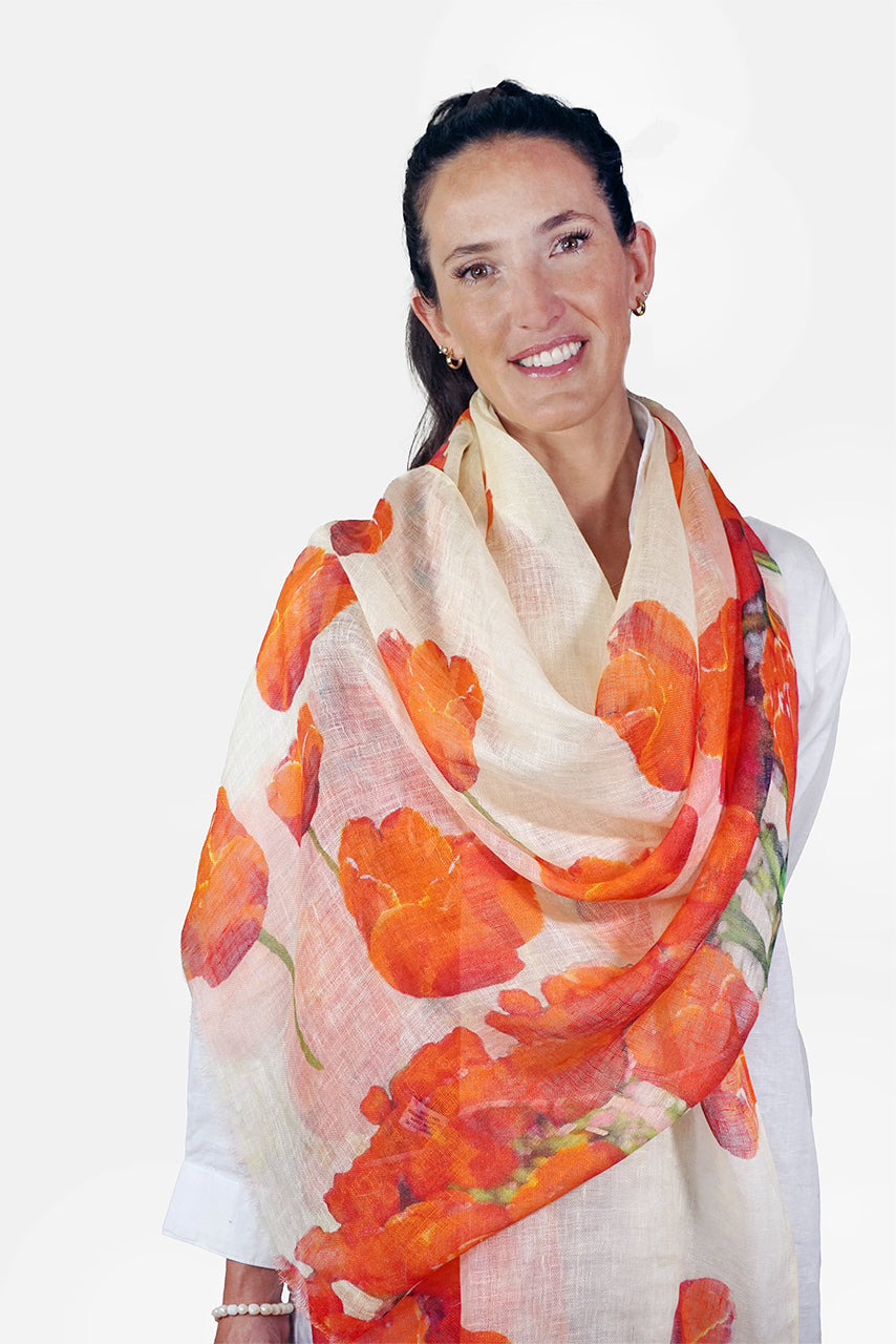 This soft linen scarf is printed with a design of large tulips in different shades of red and orange with green stems scattered over a white background. Our linen scarves are 65x190cm in size.