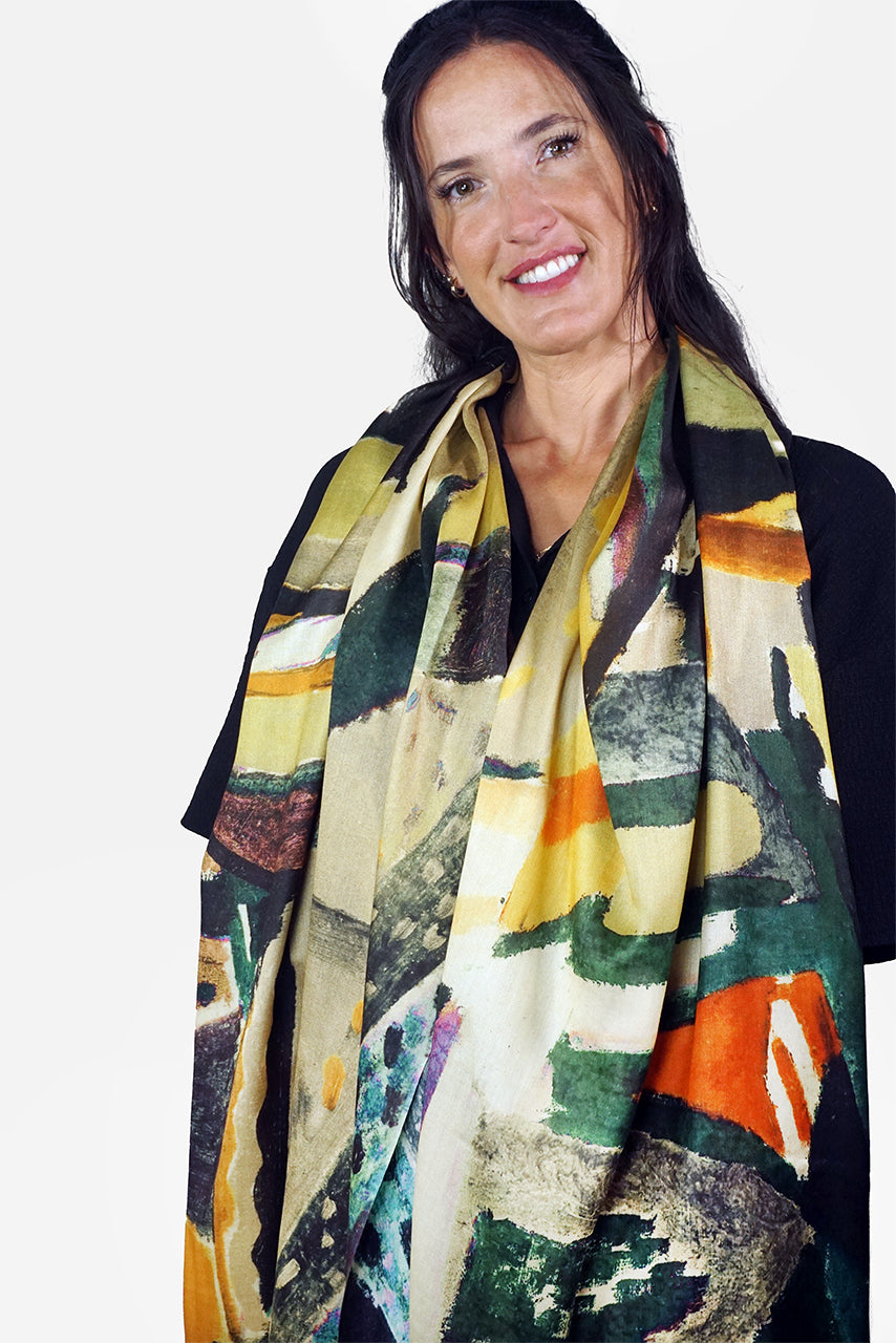 This silk scarf is woven from fine mulberry silk and printed with an abstract design of differing painted strokes. Although the scarf is multi-coloured there is a predominance of forest green and burnt orange. A great gift for someone special. Our silk scarves are 70x180cm in size.