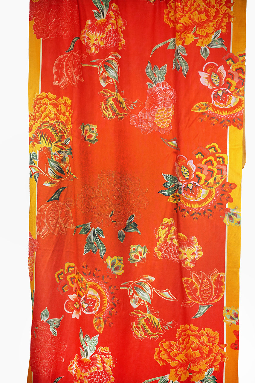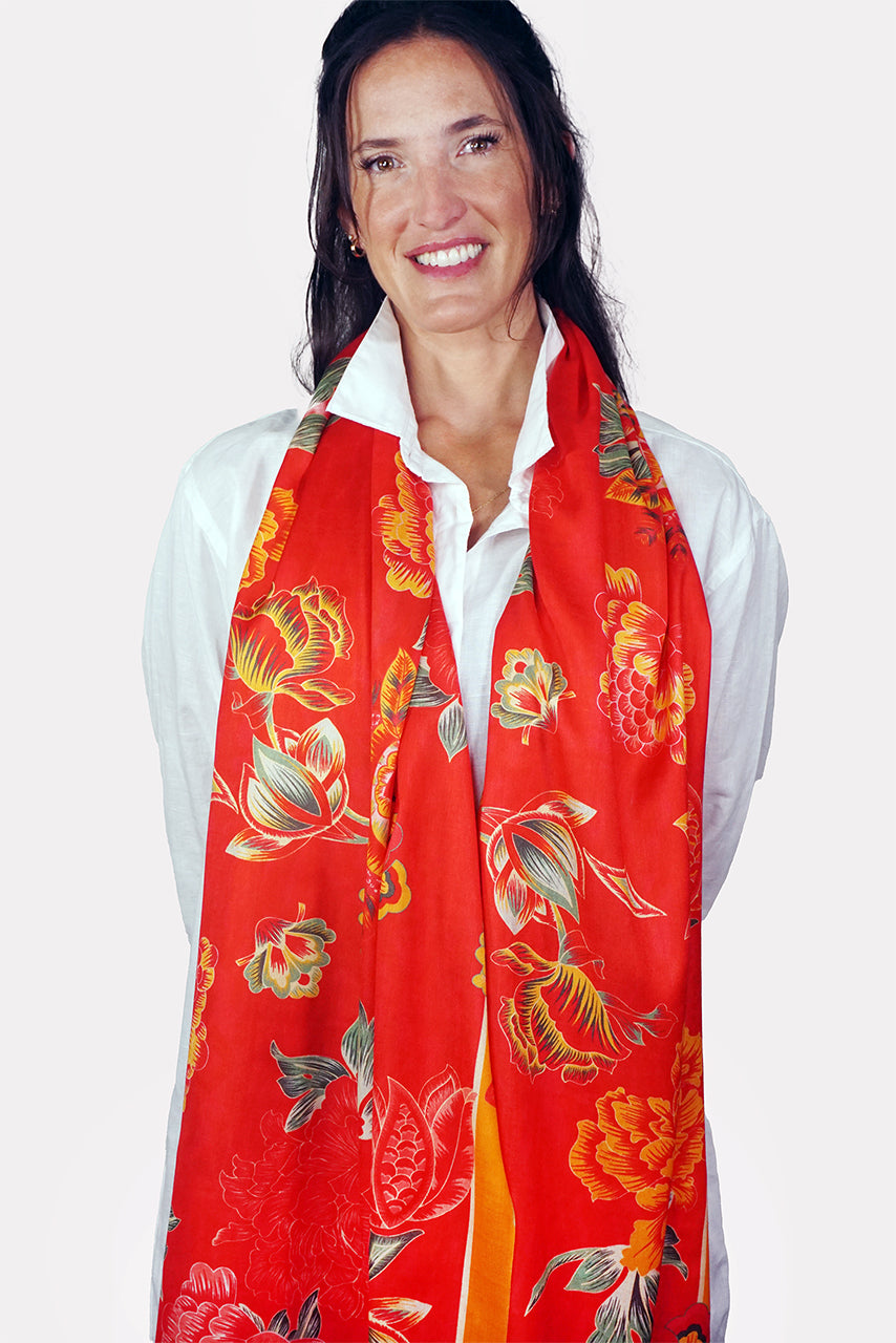 This silk scarf is woven from fine mulberry silk and printed with an oriental-inspired design of multi-coloured stylised flowers on a red background with a yellow stripe border. A great gift for someone special. Our silk scarves are 70x180cm in size.