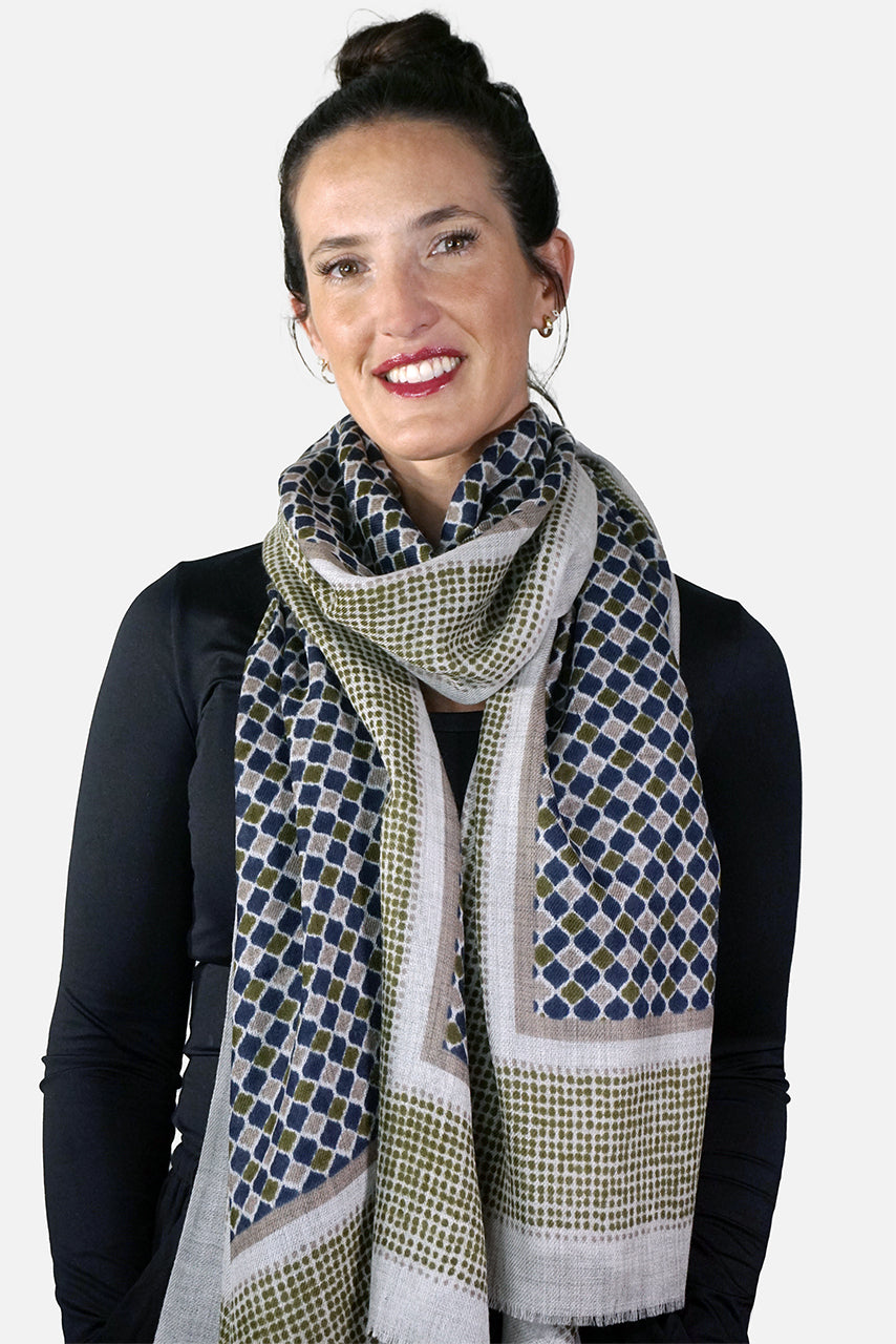 This stylish Australian merino wool scarf has a geometric print design in navy, olive and taupe diamond shapes with a wide dotty border in olive green on a woven pale grey background. Our merino wool scarves are 70x200cm.
