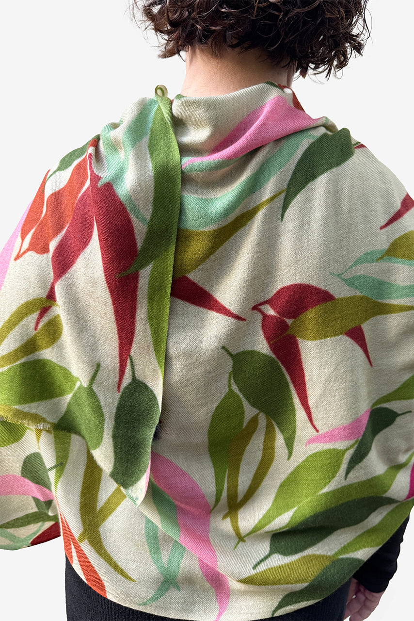 This merino wool scarf is a multicoloured design featuring Australian eucalypt leaves in varying sizes on a light background. Our merino wool scarves are 70x200cm.