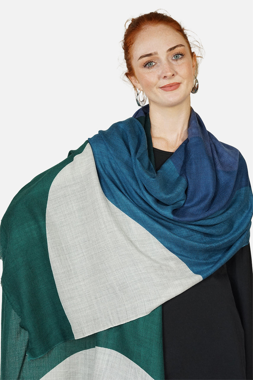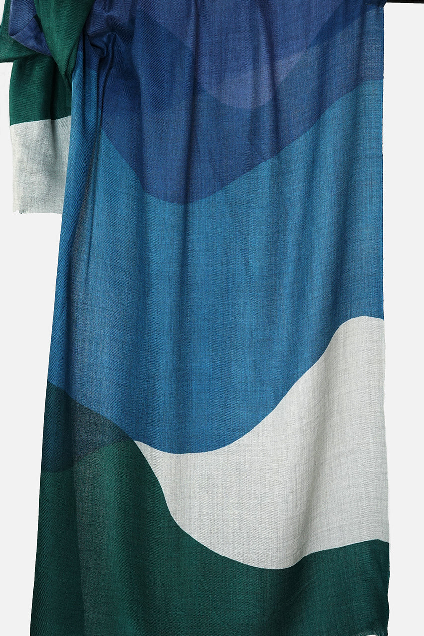 This stylish 100% Australian merino wool scarf has a print design with large overlapping shapes in cool colours of forest green, ocean blue and slate blue on a natural background. Our merino wool scarves are 70x200cm.