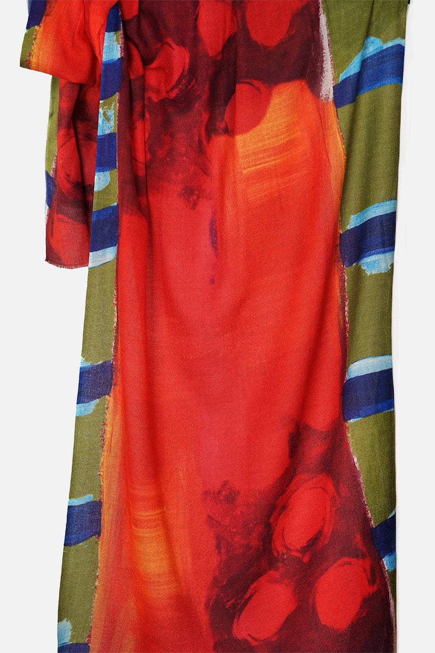 This 100% Australian merino wool scarf is an abstract, multicoloured design in different shades of red with contrasting blues and olive green. Our merino wool scarves are 70x200cm.