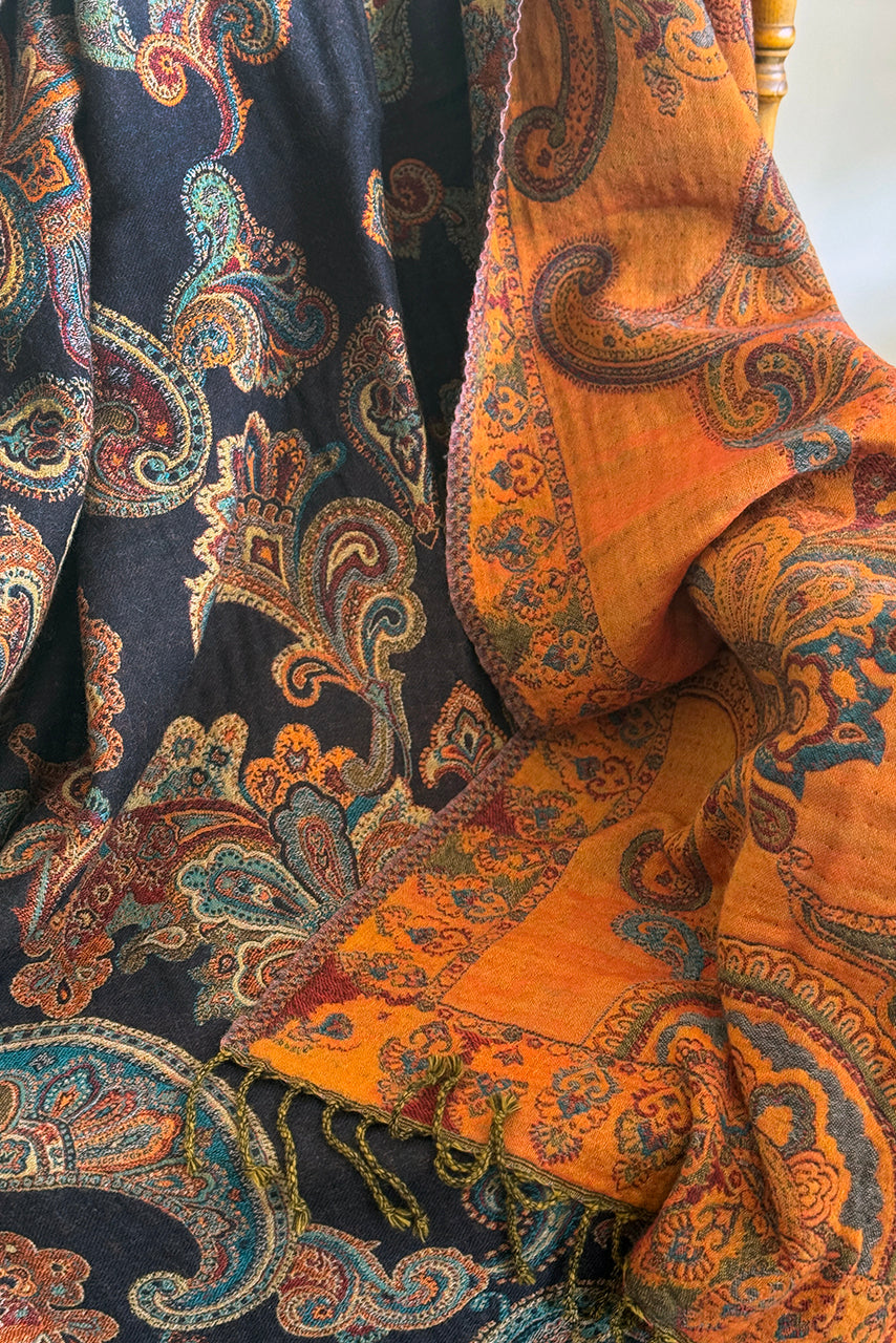 Who doesn't love a paisley throw! This throw is woven from 100% Australian merino wool. The cosy throw is a reversible paisley design that is navy blue with multi-coloured paisley motifs on one side and contrasting orange on the reverse side. It is 150x225cm in size. A pop of colour for your home or the perfect gift for a special occasion.